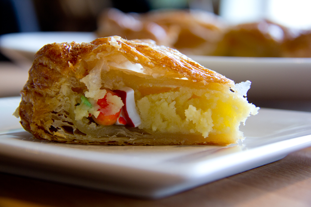 The English name for the cake would be “King’s Cake.” It is a part of Twelfth Night celebration in honour of the Christian holiday of Epiphany in January. The cake is made with puffed pastry with a topping of powdered sugar wrapping the rich almond cream.