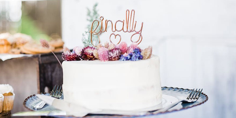 2. Mr & Mrs Cake Topper: The “Mr & Mrs” cake topper is a popular choice for newlyweds, symbolising the beginning of a shared journey. It’s a classic and elegant option that adds a personal touch to your wedding cake. Whether crafted in sleek script or with a more whimsical design, a Mr & Mrs cake topper beautifully crowns your cake and becomes a lovely keepsake after the wedding. These toppers can be customised in various styles and materials, making them versatile for any wedding theme.